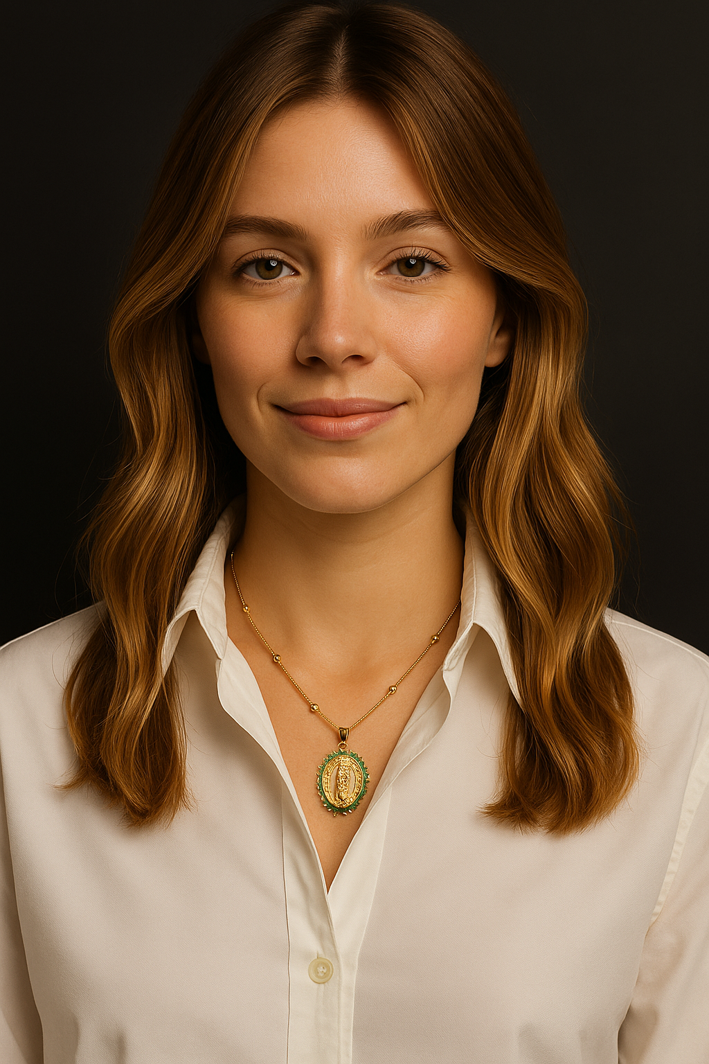 A piece of faith and elegance, this Choker #469 features a delicate gold bead-accented chain paired with an oval Virgin of Guadalupe pendant framed by brilliant green crystals. Symbolizing devotion and protection, this design carries both spiritual meaning and timeless style. Crafted with Guaranteed 18k gold plating, it is hypoallergenic, nickel-free, and water resistant, ensuring lasting beauty and comfort for everyday wear. A radiant necklace to keep close to your heart.