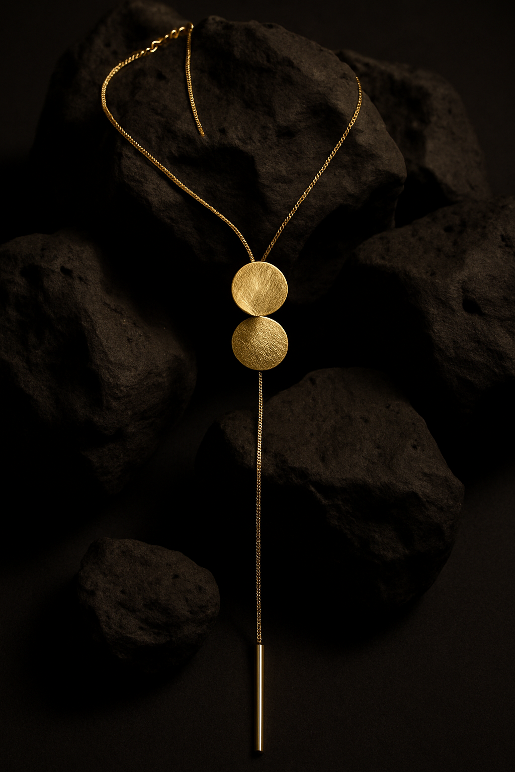 Modern and sleek, this Box Chain Necklace #455 features two polished golden discs with a graceful pendulum drop for a chic, minimalist statement. Its long, elegant silhouette flatters any neckline, making it perfect for layering or wearing solo as a bold accent piece. Crafted with Guaranteed 18k gold plating, it is hypoallergenic, nickel-free, and water resistant, ensuring lasting shine and comfort for everyday wear. A versatile design that transitions effortlessly from day to night.