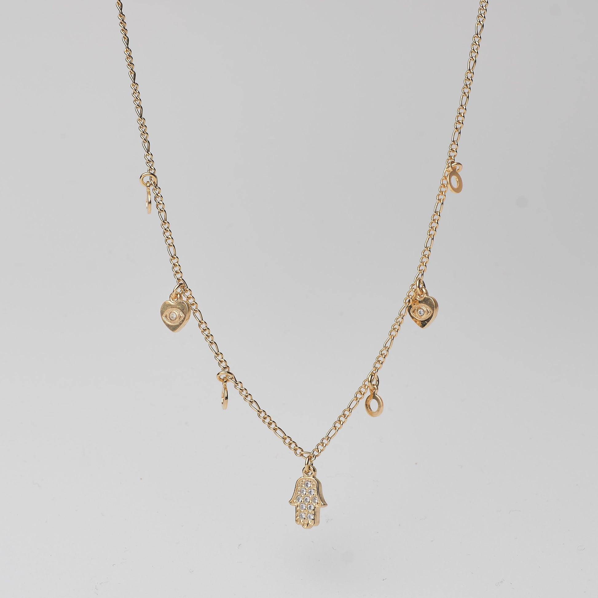 Carry beauty and protection with the Hamsa Hand Charm Choker, adorned with delicate crystal accents for a subtle sparkle. Dangling symbols, including the iconic Hamsa hand, add elegance and meaning to this modern design. Crafted with Guaranteed 18k gold plating, this necklace is hypoallergenic, nickel-free, and water resistant, making it the perfect piece for everyday wear. Stylish and symbolic, it’s a versatile accessory that layers beautifully or shines all on its own.
